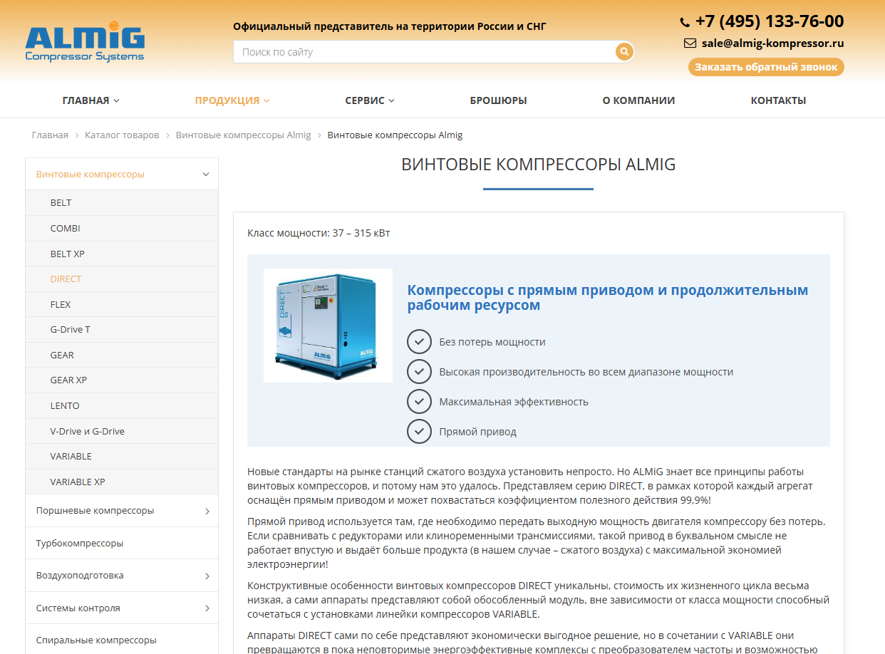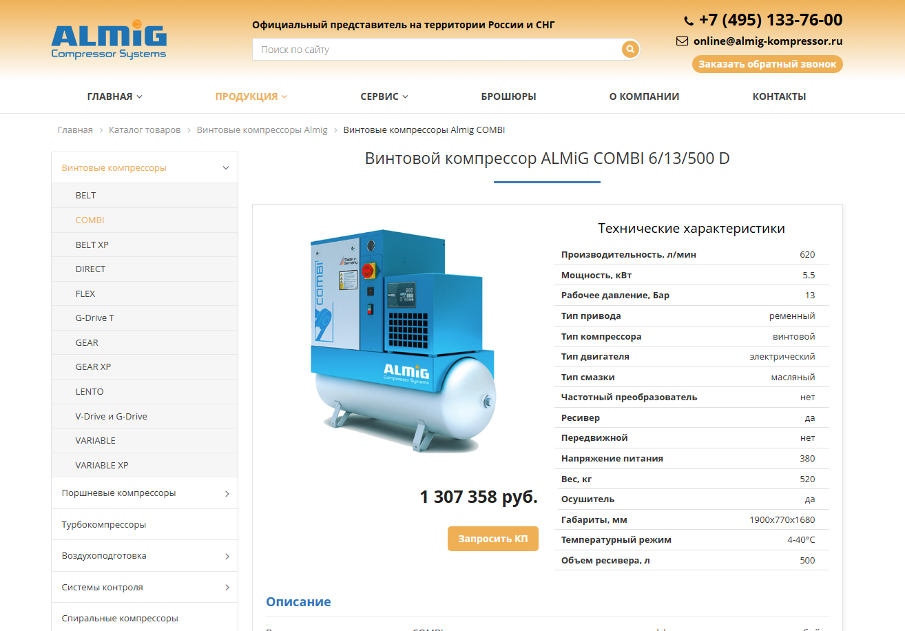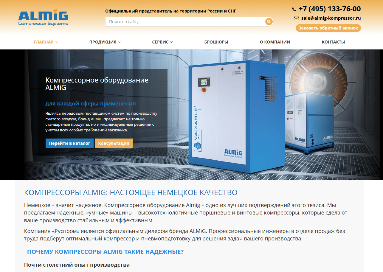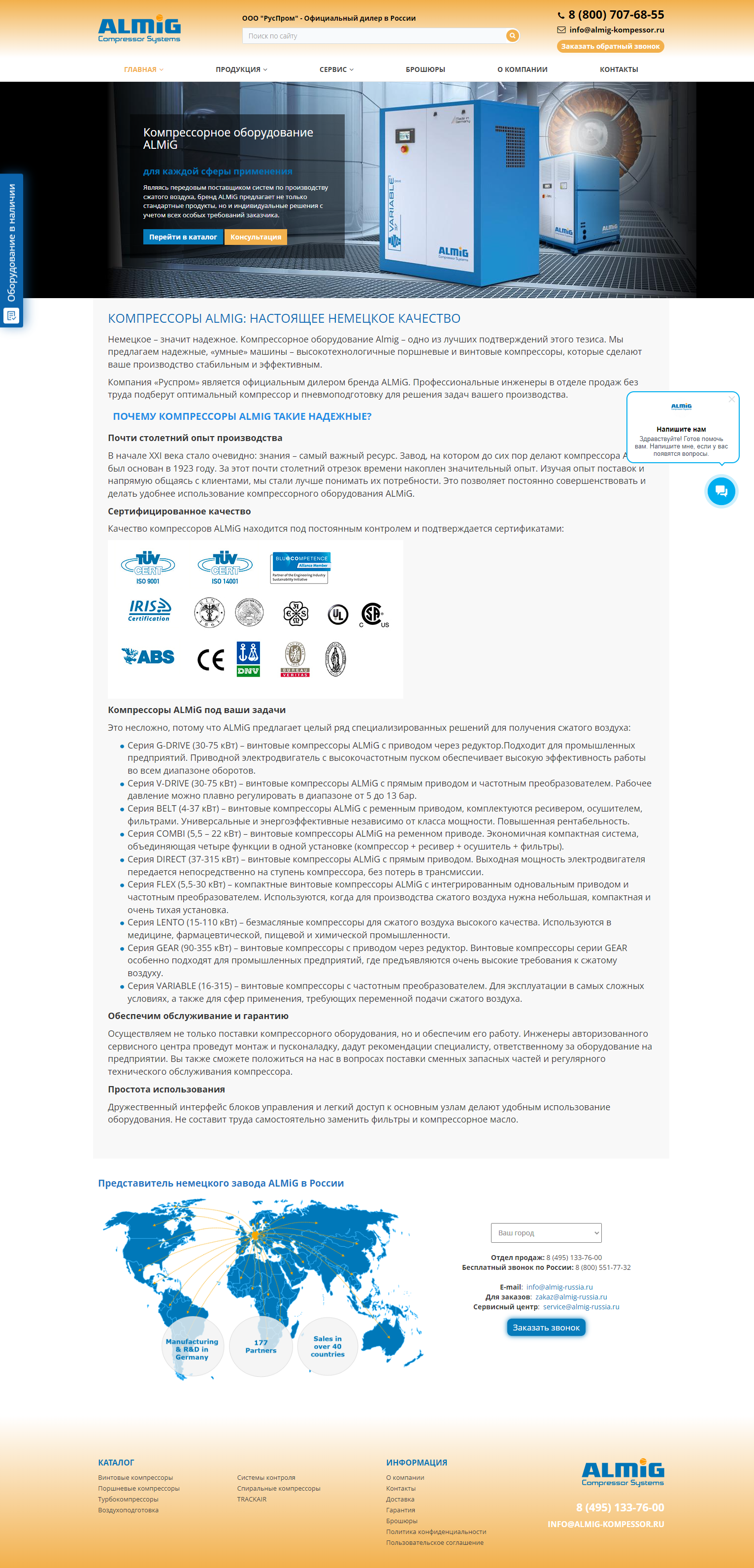 Разработать простой понятный сайт, который бы хорошо отображался на мобильных устройствах. Кроме того, сайт должен демонстрировать ассортимент компрессорного оборудования, привлекать внимание к новым товарам и специальным предложениям, формировать комьюнити лояльных покупателей.