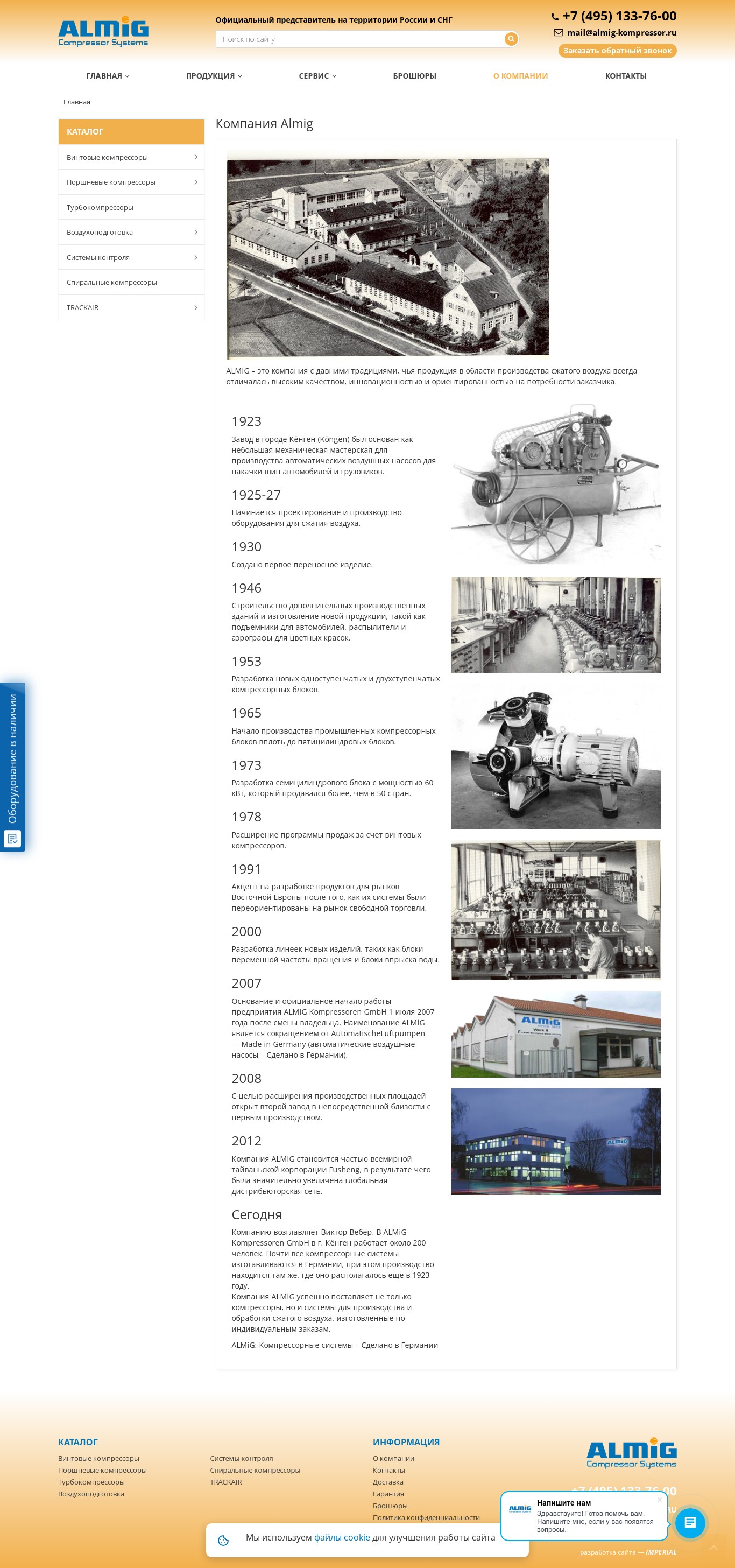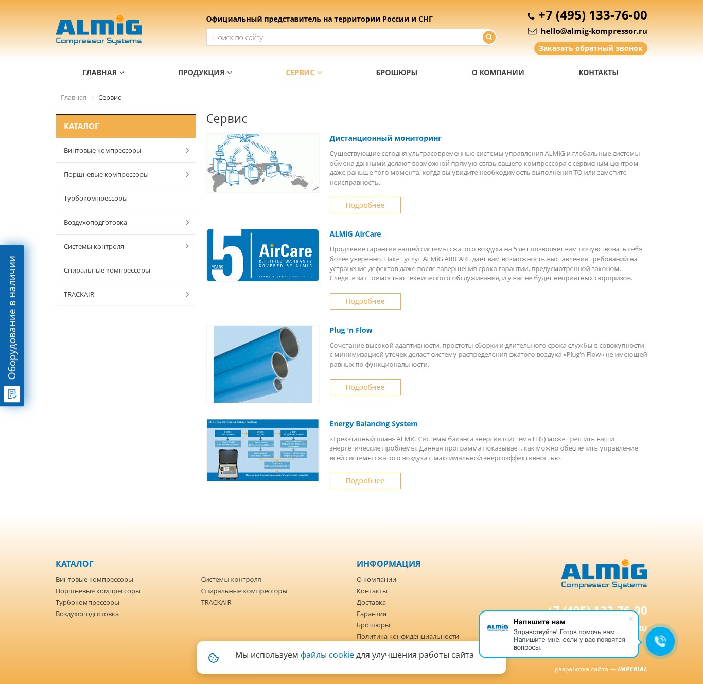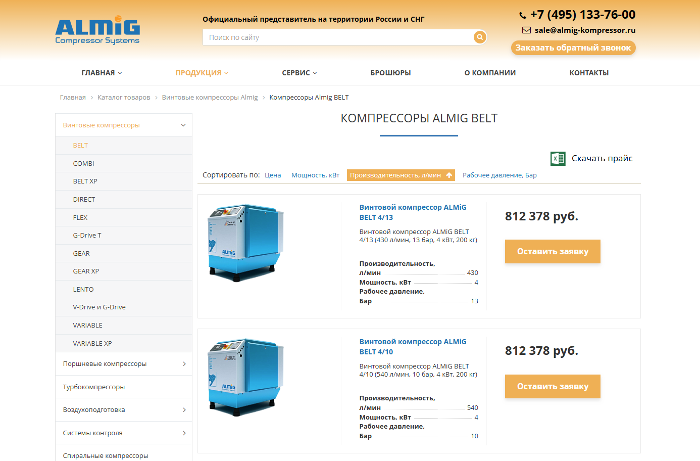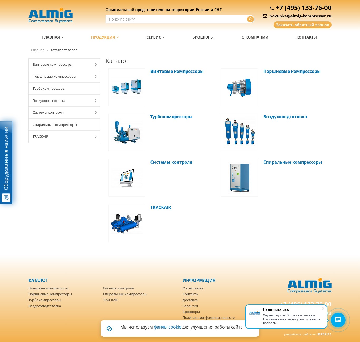 Разработать простой понятный сайт, который бы хорошо отображался на мобильных устройствах. Кроме того, сайт должен демонстрировать ассортимент компрессорного оборудования, привлекать внимание к новым товарам и специальным предложениям, формировать комьюнити лояльных покупателей.