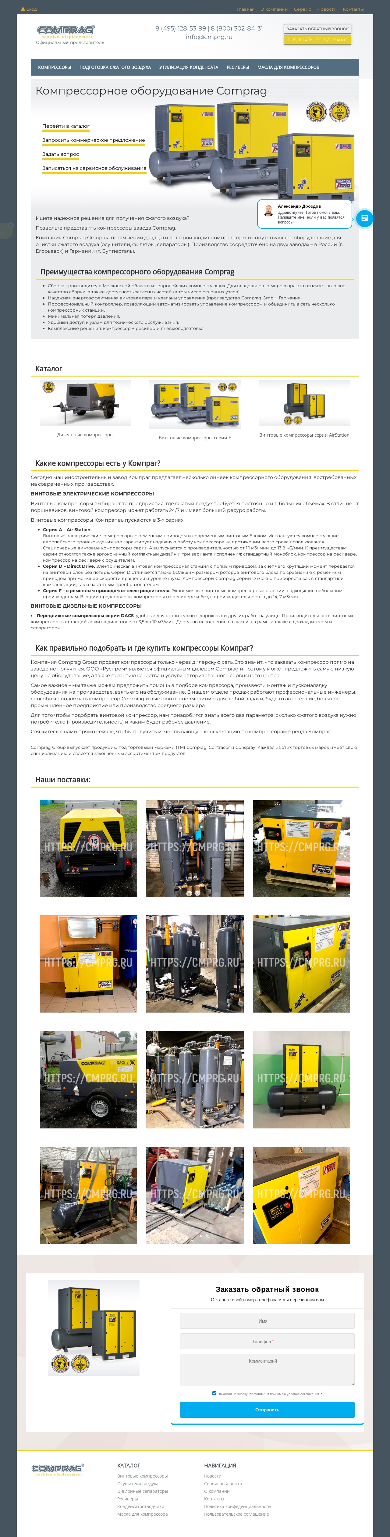 Разработать простой понятный сайт, который бы хорошо отображался на мобильных устройствах. Кроме того, сайт должен демонстрировать ассортимент компрессорного оборудования, привлекать внимание к новым товарам и специальным предложениям, формировать комьюнити лояльных покупателей.