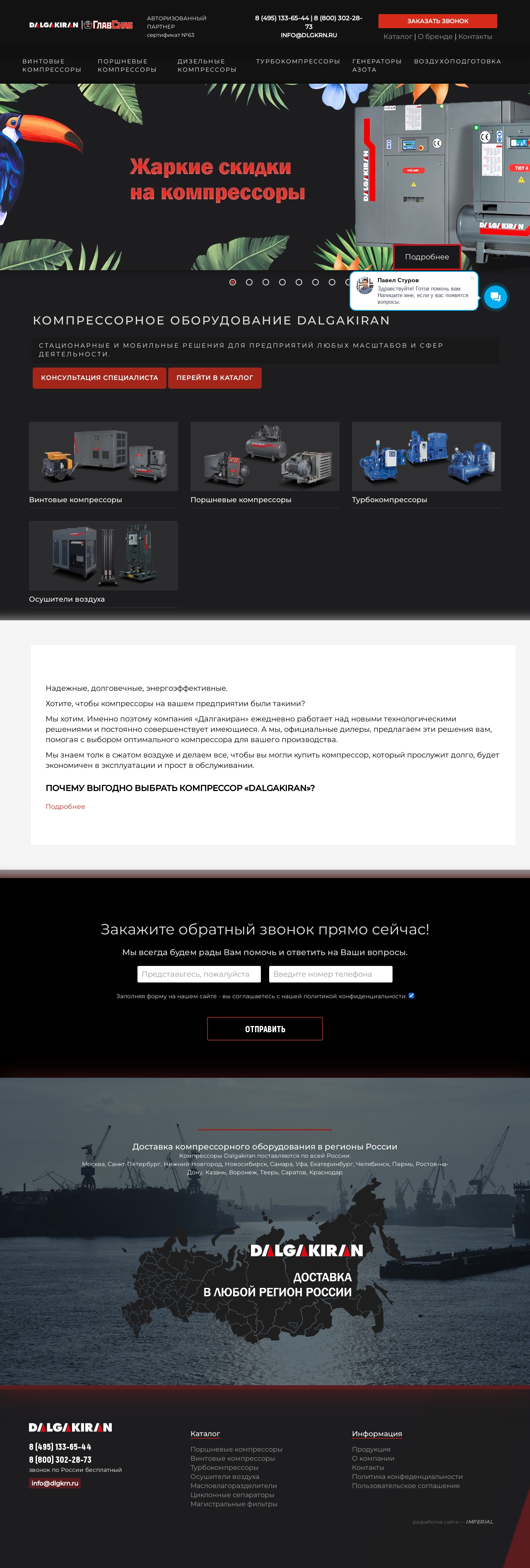 Разработать простой понятный сайт, который бы хорошо отображался на мобильных устройствах. Кроме того, сайт должен демонстрировать ассортимент компрессорного оборудования, привлекать внимание к новым товарам и специальным предложениям, формировать комьюнити лояльных покупателей.